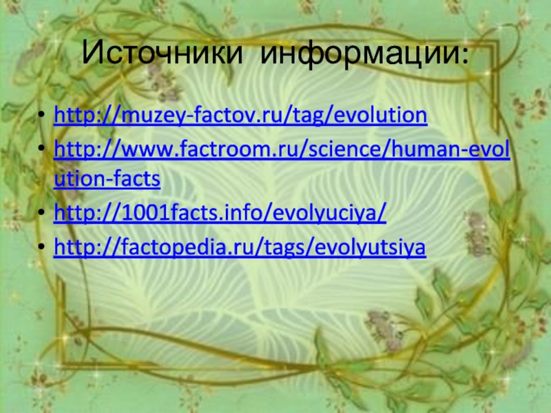 Источники информации:http://muzey-factov.ru/tag/evolutionhttp://www.factroom.ru/science/human-evolution-factshttp://1001facts.info/evolyuciya/http://factopedia.ru/tags/evolyutsiya
