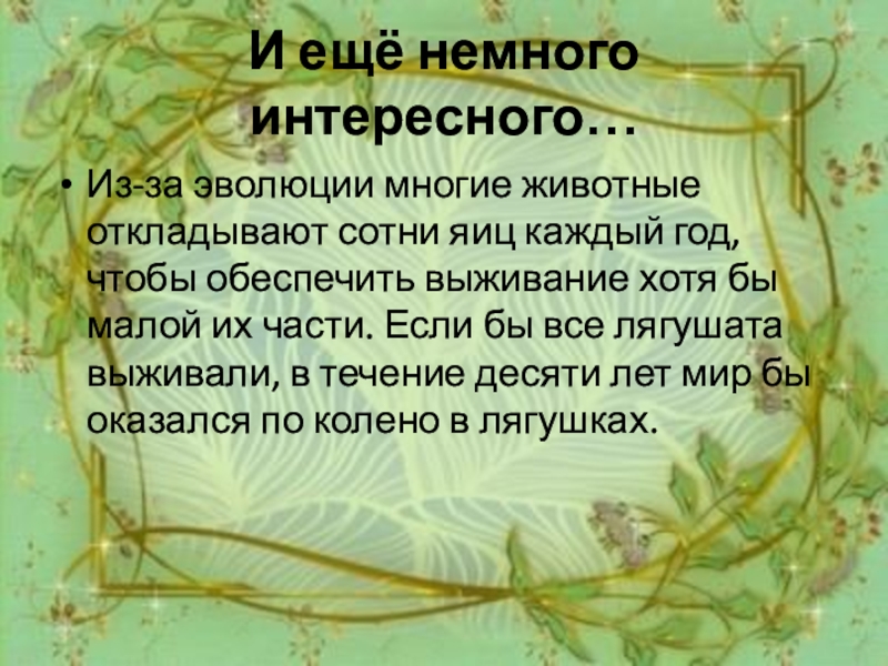 год, чтобы обеспечить выживание хотя бы малой их части. Если бы все лягушата выживали, в течение десяти лет мир бы оказался по колено в лягушках.