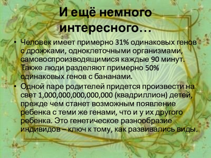 И ещё немного интересного…Человек имеет примерно 31% одинаковых генов с дрожжами, одноклеточными организмами, самовоспроизводящимися каждые 90 минут.