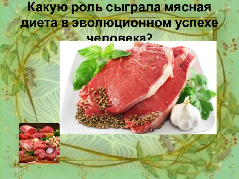 Слайд 5Какую роль сыграла мясная диета в эволюционном успехе человека?