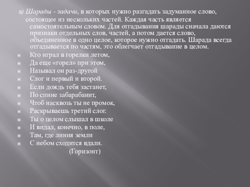 а) Шарады - задачи, в которых нужно разгадать задуманное слово,