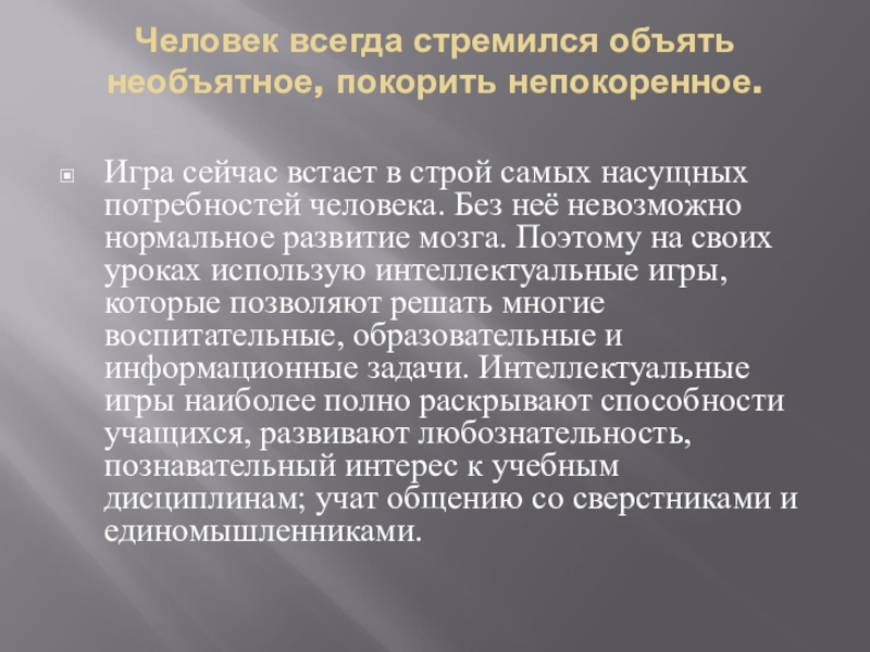 Игра сейчас встает в строй самых насущных потребностей человека. Без неё невозможно нормальное развитие мозга. Поэтому в нашей школе стало традицией проведения интеллектуальных игр, которые позволяют решать многие воспитательные, образовательные и информационные задачи. Интеллектуальные игры наиболее полно раскрывают способности учащихся, развивают любознательность, познавательный интерес к учебным дисциплинам; учат общению со сверстниками и единомышленниками.
