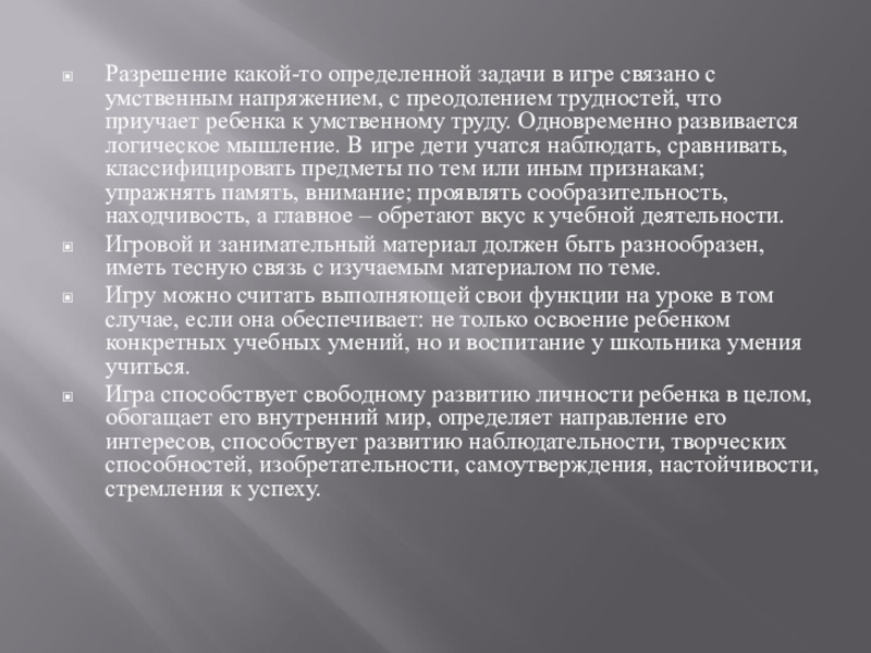 преодолением трудностей, что приучает ребенка к умственному труду. Одновременно развивается логическое мышление. В игре дети учатся наблюдать, сравнивать, классифицировать предметы по тем или иным признакам; упражнять память, внимание; проявлять сообразительность, находчивость, а главное – обретают вкус к учебной деятельности.