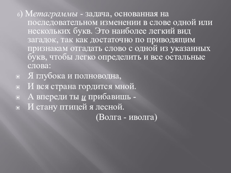 б) Метаграммы - задача, основанная на последовательном изменении в слове одной