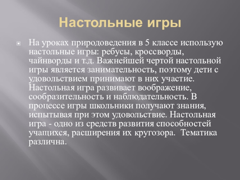 кроссворды, чайнворды и т.д. Важнейшей чертой настольной игры является занимательность, поэтому дети с удовольствием принимают в них участие. Настольная игра развивает воображение, сообразительность и наблюдательность. В процессе игры школьники получают знания, испытывая при этом удовольствие. Настольная игра - одно из средств развития способностей учащихся, расширения их кругозора. Тематика различна.