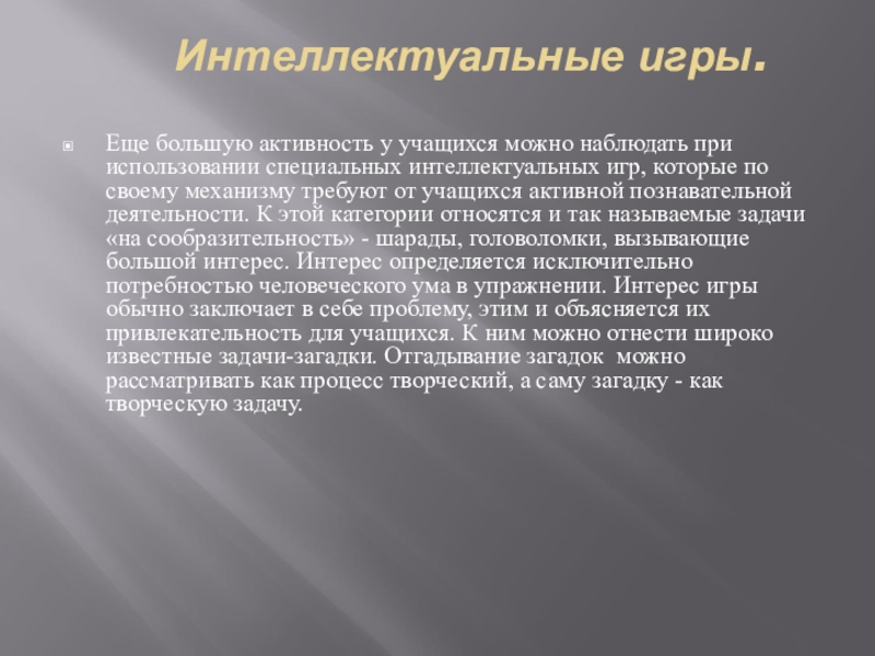 при использовании специальных интеллектуальных игр, которые по своему механизму требуют от учащихся активной познавательной деятельности. К этой категории относятся и так называемые задачи «на сообразительность» - шарады, головоломки, вызывающие большой интерес. Интерес определяется исключительно потребностью человеческого ума в упражнении. Интерес игры обычно заключает в себе проблему, этим и объясняется их привлекательность для учащихся. К ним можно отнести широко известные задачи-загадки. Отгадывание загадок можно рассматривать как процесс творческий, а саму загадку - как творческую задачу.