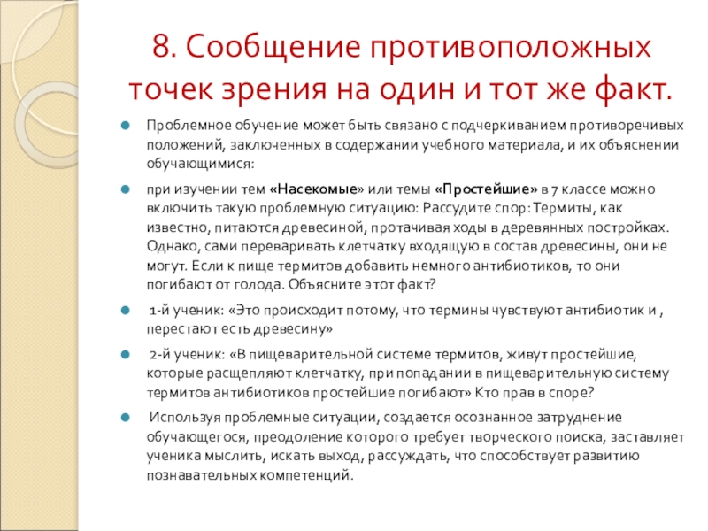 учитель подводит школьников к противоречию и предлагает им самим найти способ его решения, сталкивает противоречия практической деятельности, излагает различные точки зрения на один и тот же вопрос.