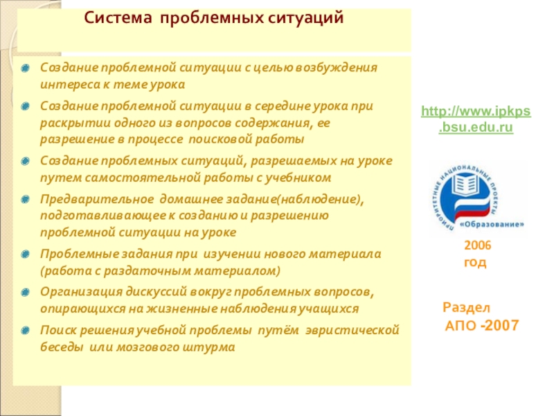 Задействовать эти внутренние психологические источники учебной мотивации возможно, используя проблемное обучение, при котором усвоение содержания обучения и развитие обучающегося происходят не путем передачи ему некоторой информации, а в процессе его собственной активной деятельности