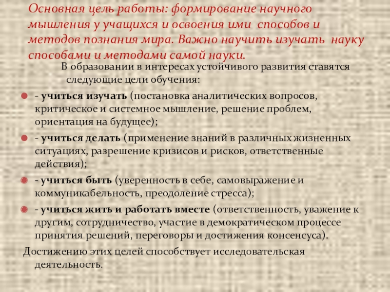 Основная цель работы: формирование научного мышления у учащихся и освоения ими способов и методов познания мира. Важно научить изучать науку способами и методами самой науки.