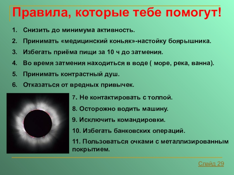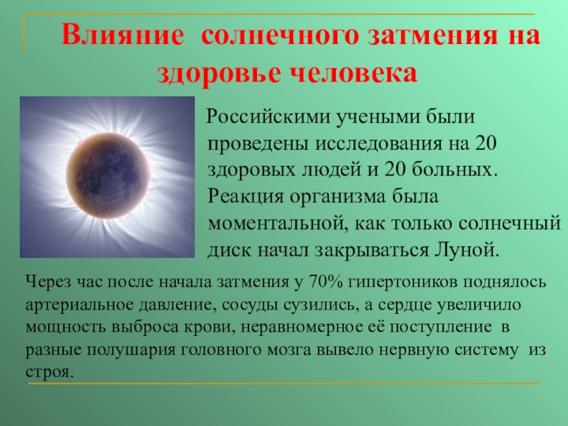 Через час после начала затмения у 70% гипертоников поднялось артериальное давление, сосуды сузились, а сердце увеличило мощность выброса крови, неравномерное её поступление в разные полушария головного мозга вывело нервную систему из строя.
