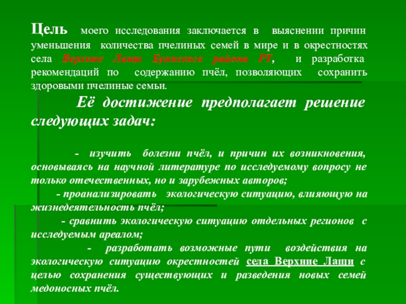 Слайд 4Цель моего исследования заключается в выяснении причин уменьшения количества пчелиных семей