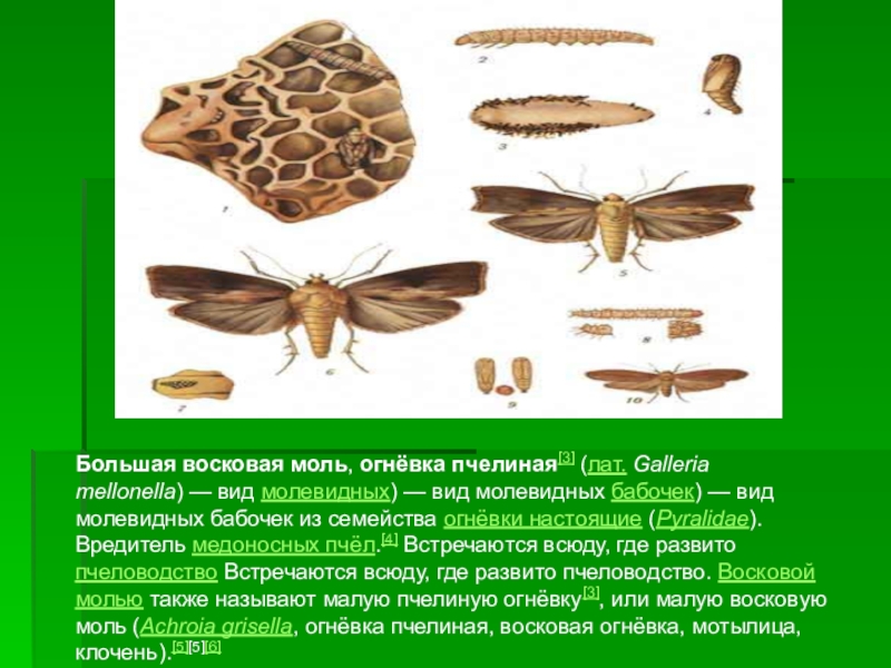 Слайд 9Большая восковая моль, огнёвка пчелиная[3] (лат. Galleria mellonella) — вид молевидных) — вид молевидных
