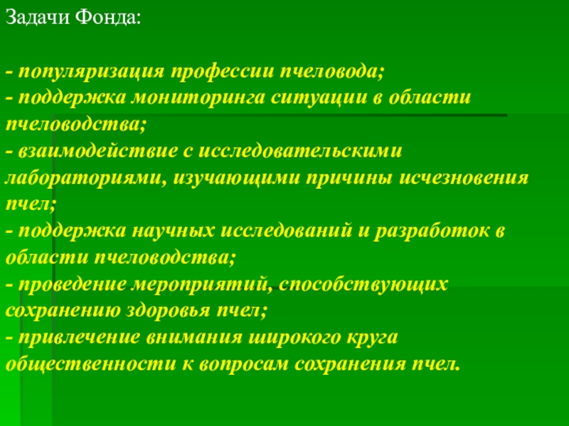 Цель Фонда: предотвращение гибели пчел в целях обеспечения экологической и продовольственной безопасности Планеты.