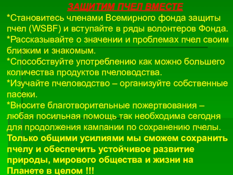 Только общими усилиями мы сможем сохранить пчелу и обеспечить устойчивое развитие природы, мирового общества и жизни на Планете в целом !!!