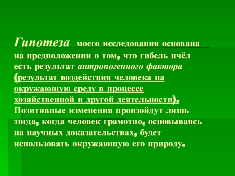 Слайд 3Гипотеза моего исследования основана на предположении о том, что гибель пчёл