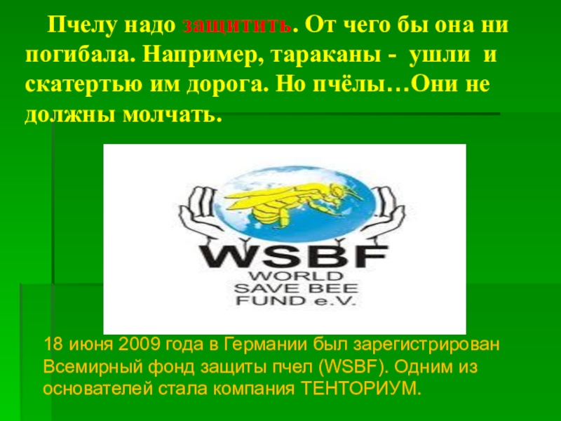 18 июня 2009 года в Германии был зарегистрирован Всемирный фонд защиты пчел (WSBF). Одним из основателей стала компания ТЕНТОРИУМ.