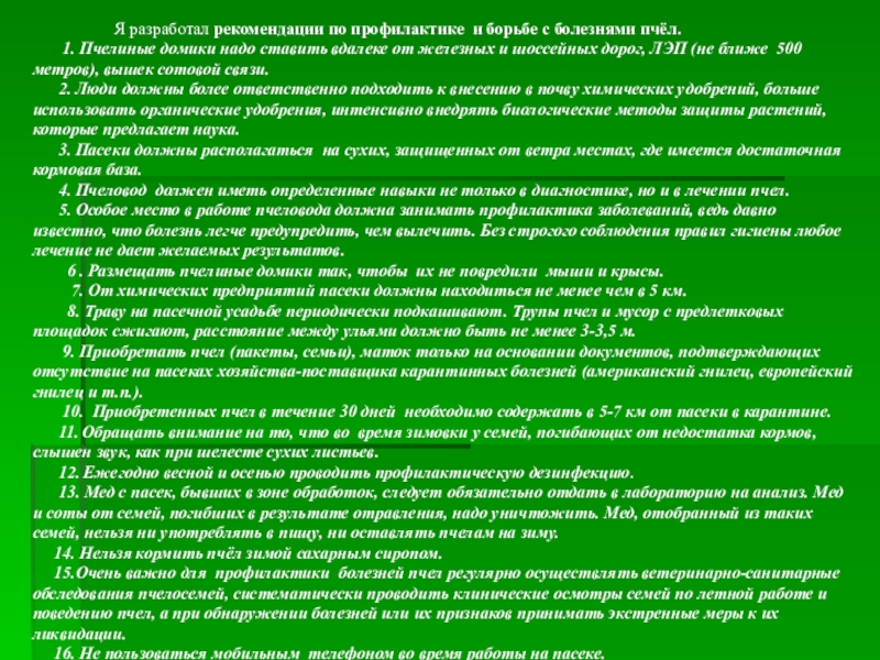 разработал рекомендации по профилактике и борьбе с болезнями пчёл.