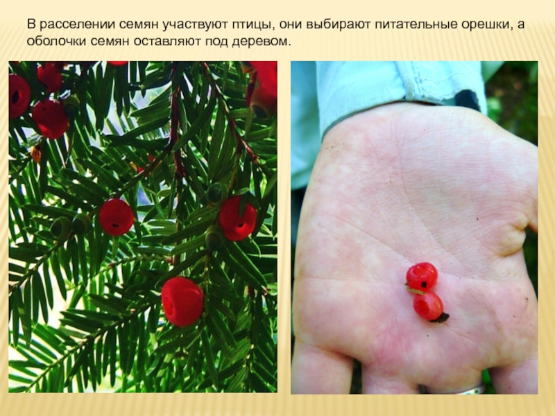 Из чешуек семяпочки образуется мясистый ярко-красный присемянник. Семя яйцевидное, с заострённой гранённой верхушкой, около 6 мм длины и 4 мм в диаметре.
