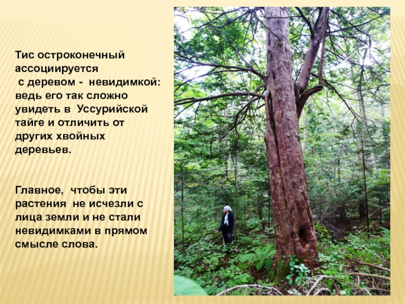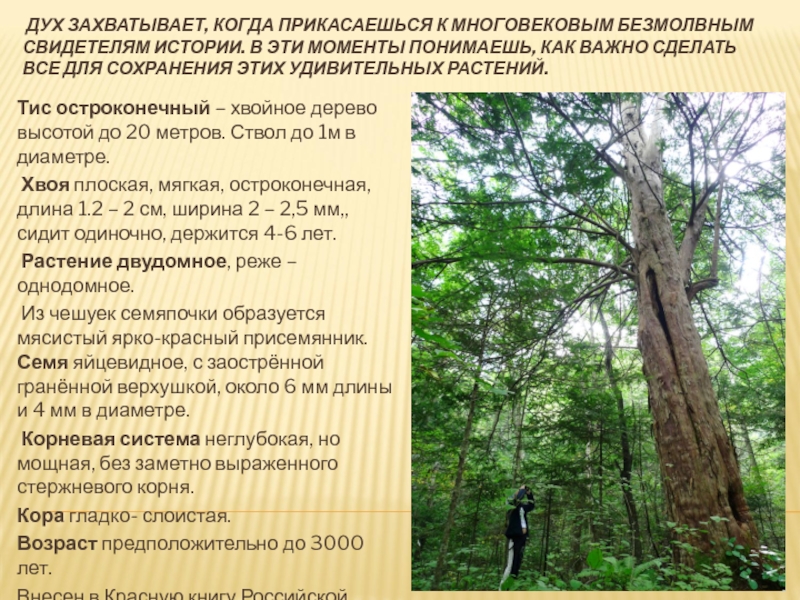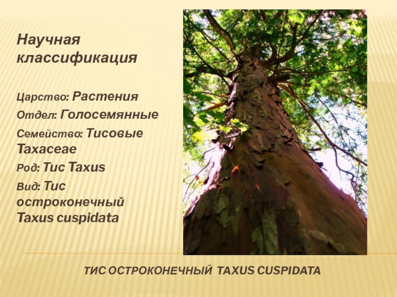 Тис остроконечный – хвойное дерево высотой до 20 метров. Ствол до 1м в диаметре.