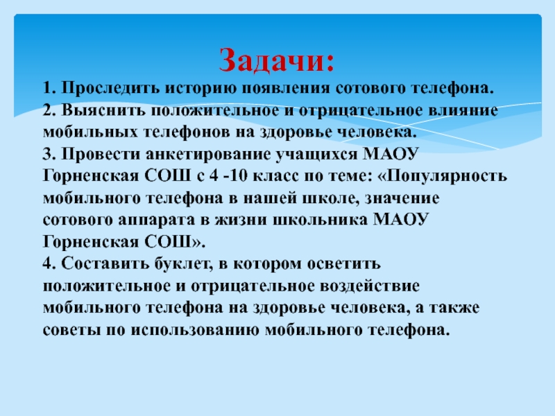 3. Провести анкетирование учащихся МАОУ Горненская СОШ с 4 -10 класс по теме: «Популярность мобильного телефона в нашей школе, значение сотового аппарата в жизни школьника МАОУ Горненская СОШ».