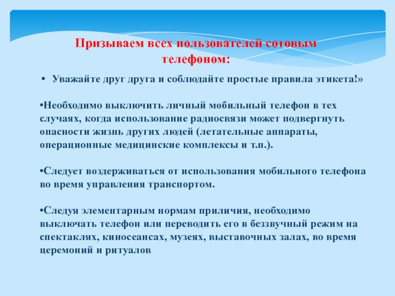 Слайд 25Призываем всех пользователей сотовым телефоном: