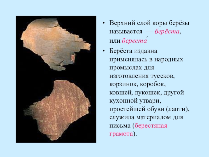 применялась в народных промыслах для изготовления туесков, корзинок, коробок, ковшей, лукошек, другой кухонной утвари, простейшей обуви (лапти), служила материалом для письма (берестяная грамота).