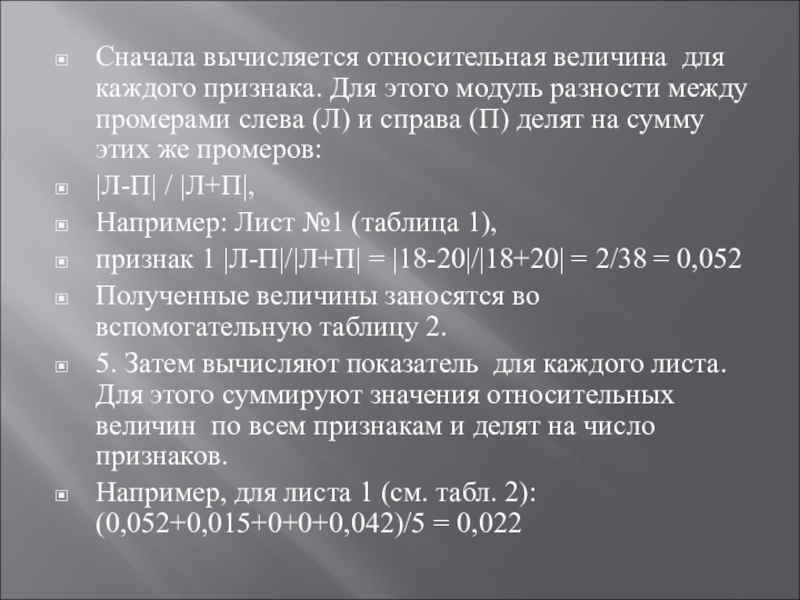 относительного различия между сторонами на признак. Для этого вычисляют среднюю арифметическую величину для выборки листьев. Это значение округляется до третьего знака после запятой.