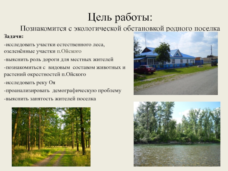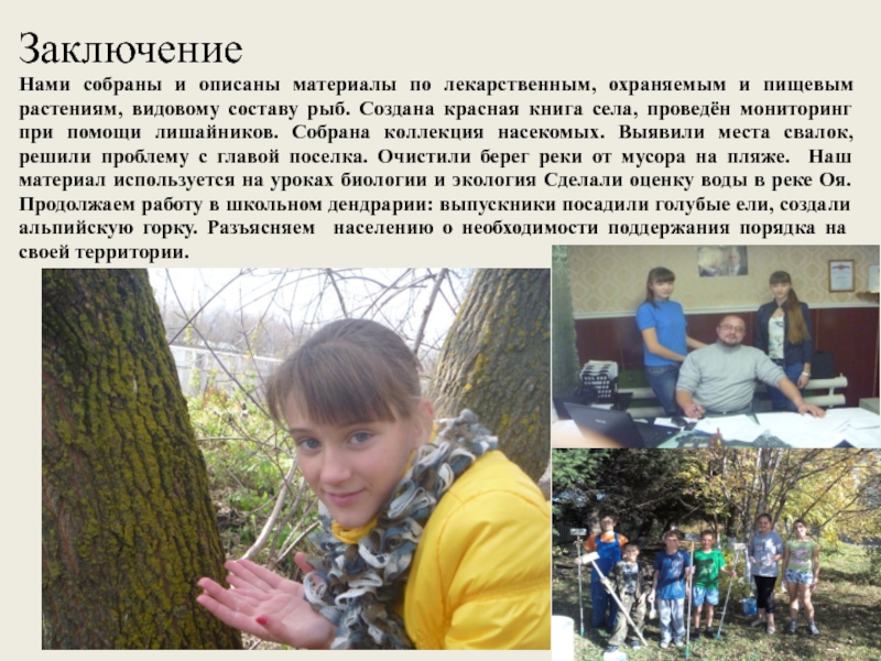 растениям, видовому составу рыб. Создана красная книга села, проведён мониторинг при помощи лишайников. Собрана коллекция насекомых. Выявили места свалок, решили проблему с главой поселка. Очистили берег реки от мусора на пляже. Наш материал используется на уроках биологии и экология Сделали оценку воды в реке Оя. Продолжаем работу в школьном дендрарии: выпускники посадили голубые ели, создали альпийскую горку. Разъясняем населению о необходимости поддержания порядка на своей территории.