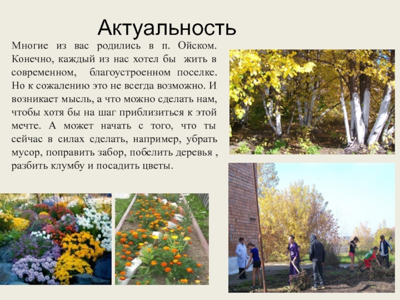 хотел бы жить в современном, благоустроенном поселке. Но к сожалению это не всегда возможно. И возникает мысль, а что можно сделать нам, чтобы хотя бы на шаг приблизиться к этой мечте. А может начать с того, что ты сейчас в силах сделать, например, убрать мусор, поправить забор, побелить деревья , разбить клумбу и посадить цветы.