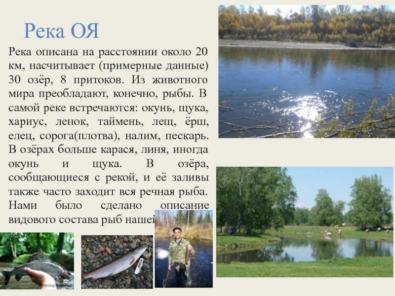 30 озёр, 8 притоков. Из животного мира преобладают, конечно, рыбы. В самой реке встречаются: окунь, щука, хариус, ленок, таймень, лещ, ёрш, елец, сорога(плотва), налим, пескарь. В озёрах больше карася, линя, иногда окунь и щука. В озёра, сообщающиеся с рекой, и её заливы также часто заходит вся речная рыба. Нами было сделано описание видового состава рыб нашей реки.