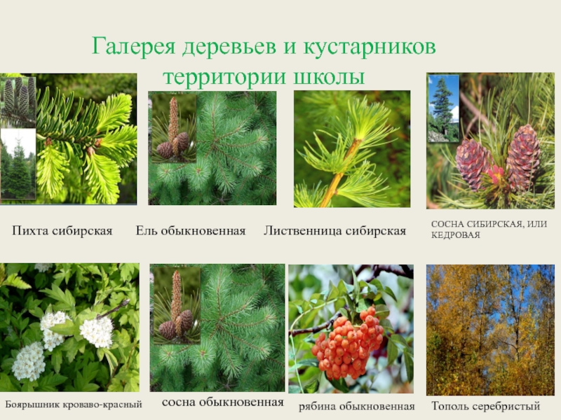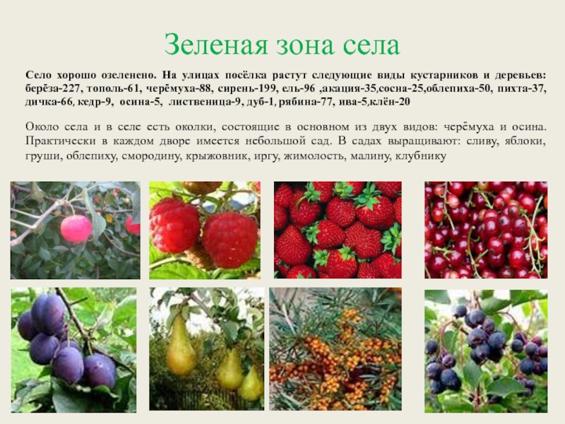 кустарников и деревьев: берёза-227, тополь-61, черёмуха-88, сирень-199, ель-96 ,акация-35,сосна-25,облепиха-50, пихта-37, дичка-66, кедр-9, осина-5, лиственица-9, дуб-1, рябина-77, ива-5,клён-20