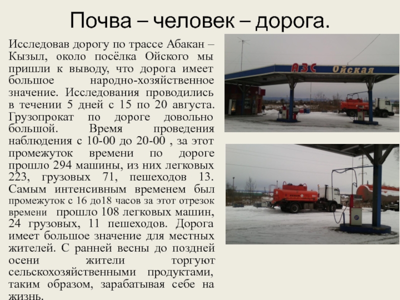 Кызыл, около посёлка Ойского мы пришли к выводу, что дорога имеет большое народно-хозяйственное значение. Исследования проводились в течении 5 дней с 15 по 20 августа. Грузопрокат по дороге довольно большой. Время проведения наблюдения с 10-00 до 20-00 , за этот промежуток времени по дороге прошло 294 машины, из них легковых 223, грузовых 71, пешеходов 13. Самым интенсивным временем был промежуток с 16 до18 часов за этот отрезок времени прошло 108 легковых машин, 24 грузовых, 11 пешеходов. Дорога имеет большое значение для местных жителей. С ранней весны до поздней осени жители торгуют сельскохозяйственными продуктами, таким образом, зарабатывая себе на жизнь.