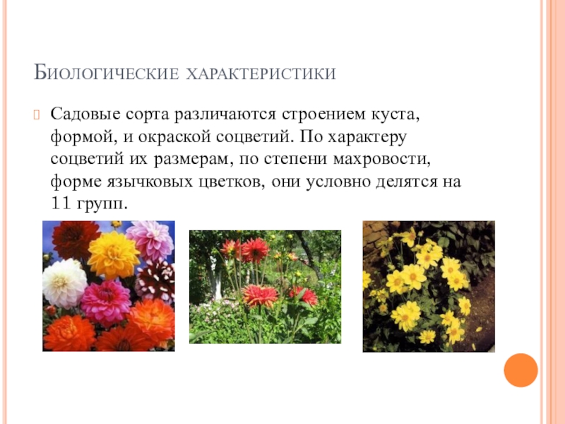 характеру соцветий их размерам, по степени махровости, форме язычковых цветков, они условно делятся на 11 групп.