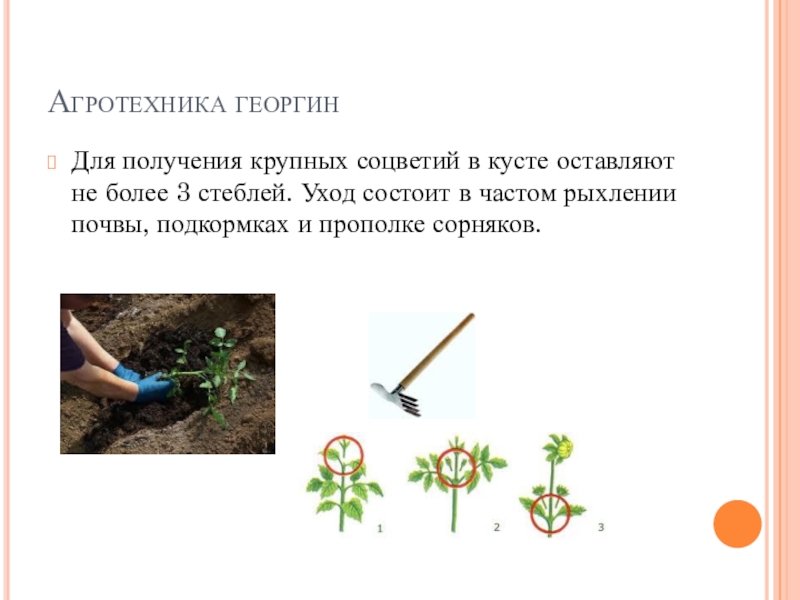 Агротехника георгинДля получения крупных соцветий в кусте оставляют не более 3 стеблей. Уход состоит в частом рыхлении