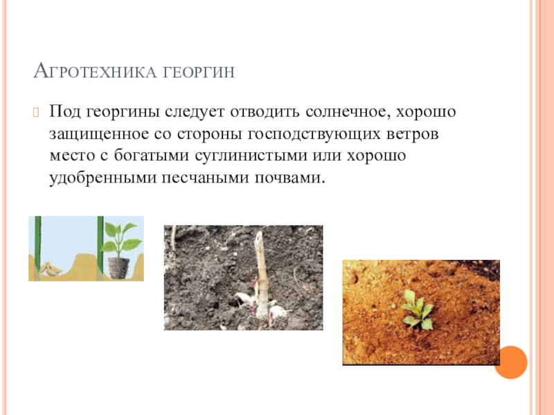 Агротехника георгинПод георгины следует отводить солнечное, хорошо защищенное со стороны господствующих ветров место с богатыми суглинистыми или