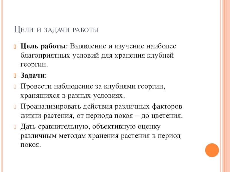 Цели и задачи работы Цель работы: Выявление и изучение наиболее благоприятных условий для хранения клубней георгин.Задачи:Провести наблюдение за клубнями георгин, хранящихся в разных условиях.Проанализировать действия различных факторов жизни растения, от периода покоя – до цветения.Дать сравнительную,