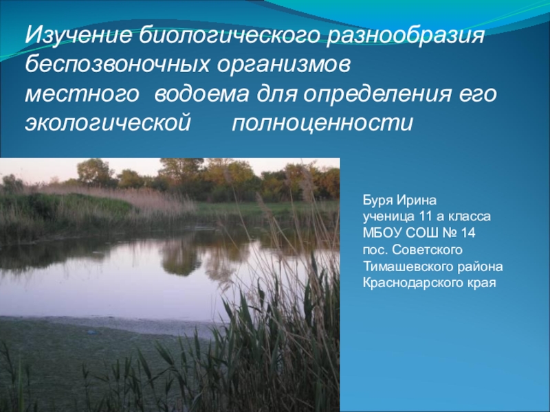 В рамках национальной задачи сохранения биоразнообразия в масштабе конкретной экосистемы местного водоема были изучены населяющие его