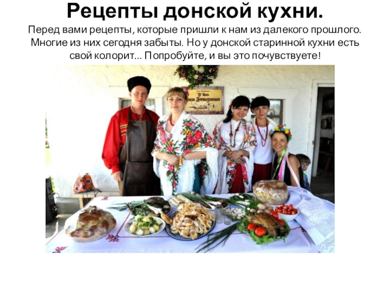 прошлого. Многие из них сегодня забыты. Но у донской старинной кухни есть свой колорит... Попробуйте, и вы это почувствуете!