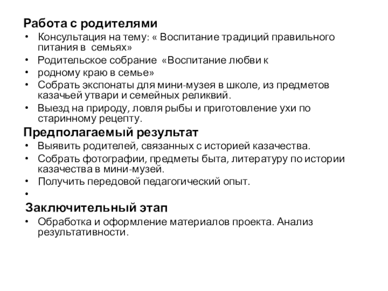 Немалое внимание уделено аспекту знакомства детей с историей возникновения и развития традиций питания донского казачества; развитиютворческого потенциала детей средствами фольклора и словотворчества, связанных с передачей традиций, бытующих в Ростовской области. Большое значение имеет привитие интереса у детей к коллекционированию и желанию собирать и добывать информацию о предметах старины (кухонная утварь) совместно с учителями и родителями. Данная работа способствует воспитанию гордости за героическое прошлое наших земляков-казаков, привития интереса к традициям и обрядам; развитию чувства коллективного творчества.