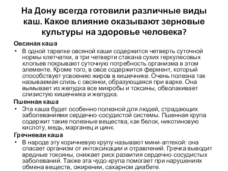 Слайд 15На Дону всегда готовили различные виды каш. Какое влияние оказывают зерновые