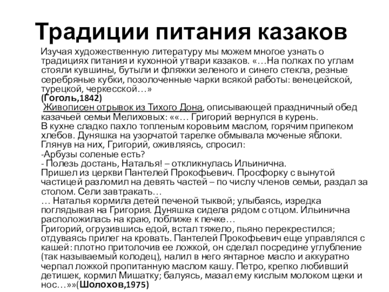 Живописен отрывок из Тихого Дона, описывающей праздничный обед казачьей семьи Мелиховых: ««… Григорий вернулся в курень.