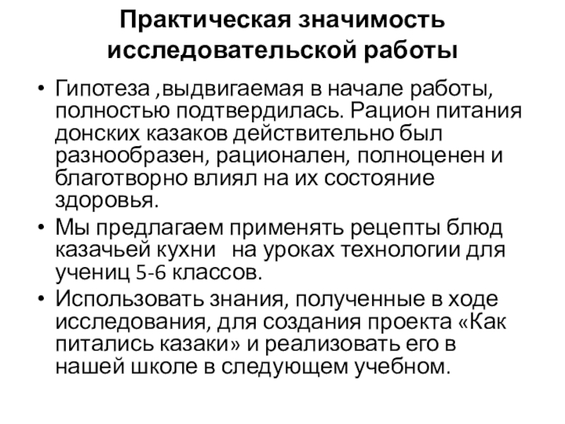Использовать знания, полученные в ходе исследования, для создания проекта «Как питались казаки» и реализовать его в нашей школе в следующем учебном.