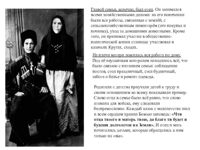 Родители с детства приучали детей к труду и своим отношением ко всему показывали пример. Слово отца в семье было всё равно, что слово атамана для войска, ему следовали беспрекословно. Каждый казак с малолетства знал и всем сердцем хранил Божью заповедь: «Чти отца твоего и матерь твою, да благо ти будет и будеши долголетен на Земли». И отец и мать почитались детьми, которые обращались к ним только на «вы».