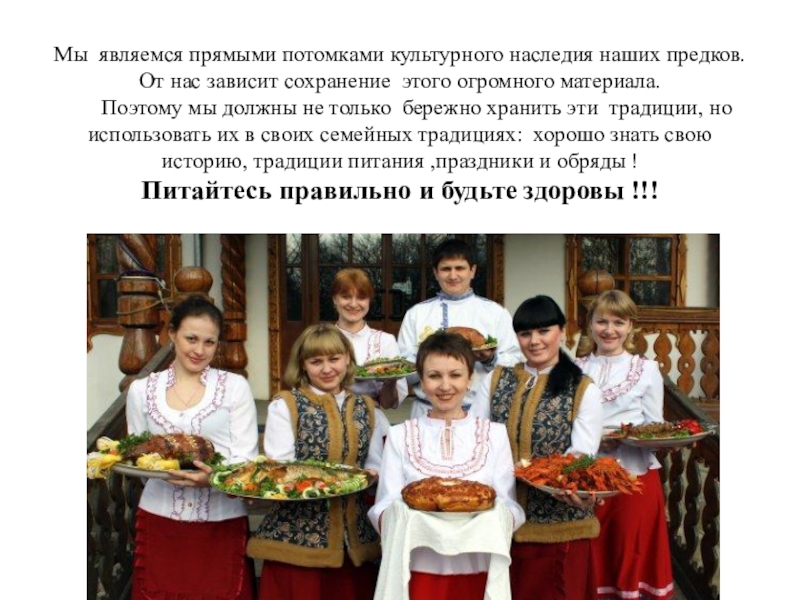 Поэтому мы должны не только бережно хранить эти традиции, но использовать их в своих семейных традициях: хорошо знать свою историю, традиции питания ,праздники и обряды !