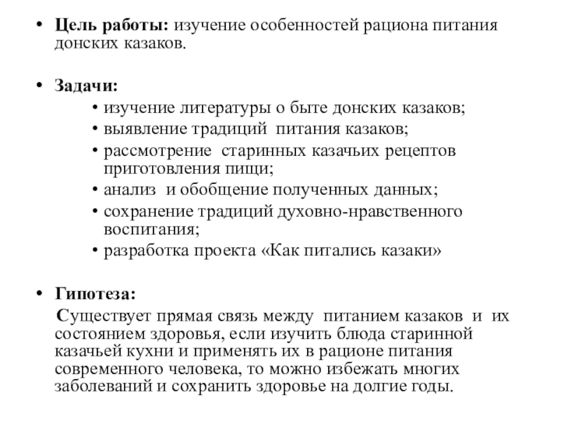 Слайд 3Цель работы: изучение особенностей рациона питания донских казаков.