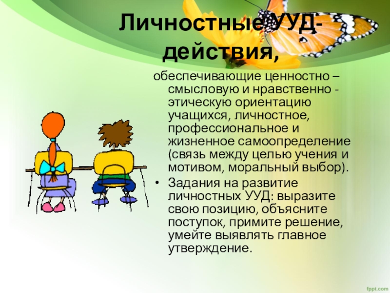 Задания на развитие личностных УУД: выразите свою позицию, объясните поступок, примите решение, умейте выявлять главное утверждение.
