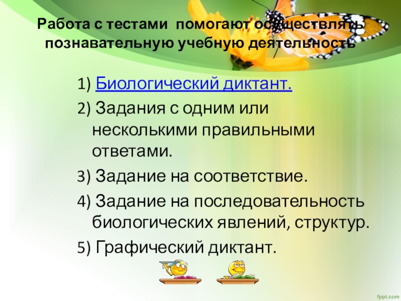 Слайд 19Работа с тестами помогают осуществлять познавательную учебную деятельность