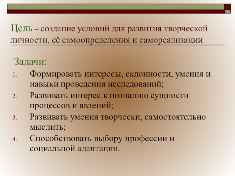 Слайд 5Цель – создание условий для развития творческой личности, её самоопределения и