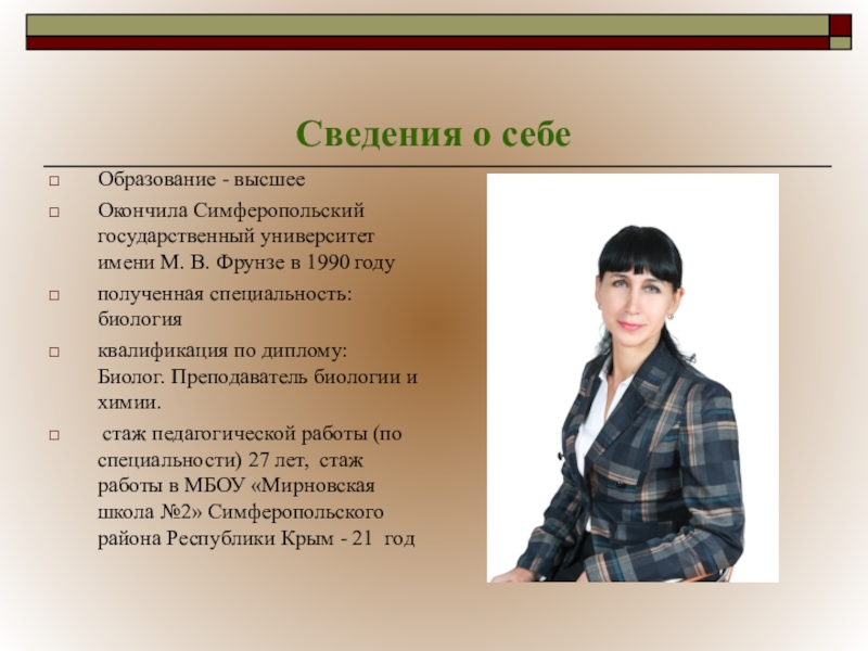стаж педагогической работы (по специальности) 27 лет, стаж работы в МБОУ «Мирновская школа №2» Симферопольского района Республики Крым - 21 год