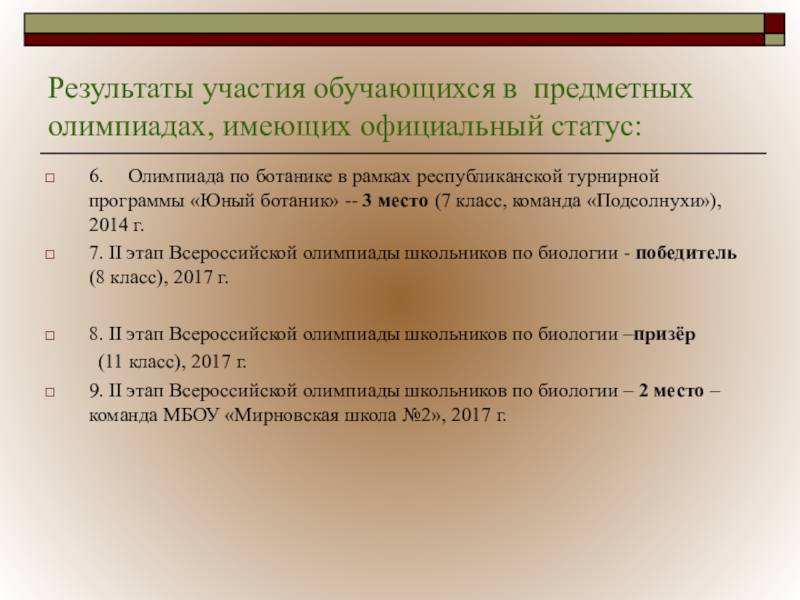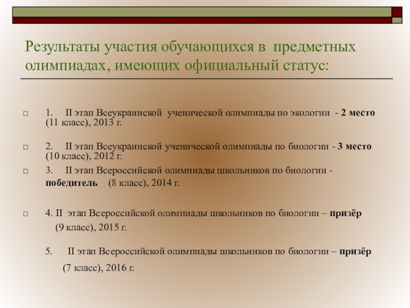 Слайд 27Результаты участия обучающихся в предметных олимпиадах, имеющих официальный статус: